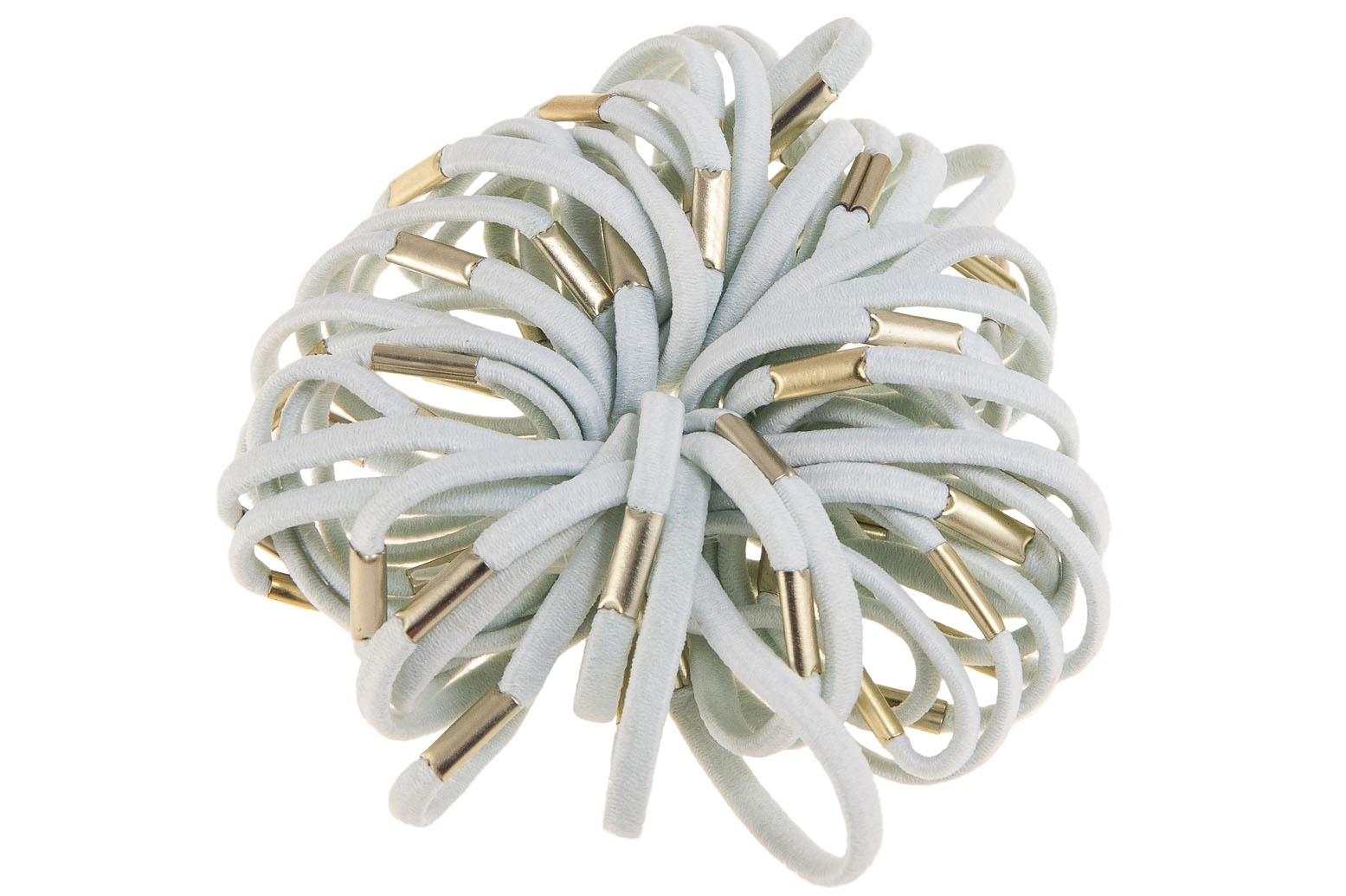Klasyczne gumki do włosów łączone metalową blaszką. Gumki są wytrzymałe i dobrze trzymają włosy.Zestaw składa się z gumek w kolorze białym.