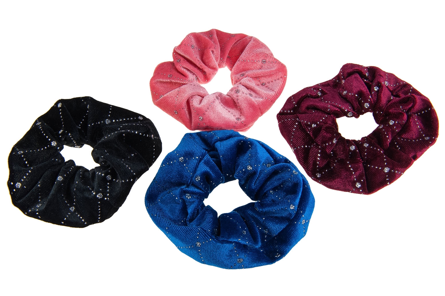 Modna gumka do włosów, wykonana ze gładkiego materiału, ozdobionego brokatem.Zestaw składa się z czterech kolorów: różowy, bordowy, niebieski i czarny.
