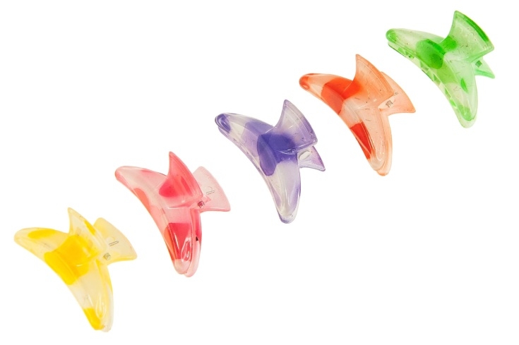 Małe szczęki do włosów. Zestaw składa się z pięciu kolorów: żółty, fioletowy, pomarańczowy, żółty i różowy:Długość: 4 cm