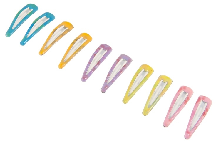 Zestaw składa się ze spinek w kolorze: żółty, pomarańczowy, fioletowy, niebieski i różowy .