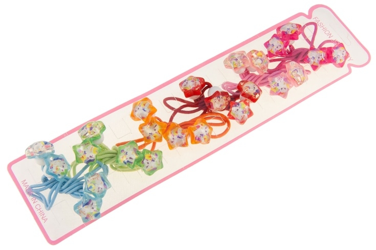 Klasyczne gumki do włosów z ozdobami w kształcie gwiazdek.Zestaw składa się z sześciu kolorów: niebieski, zielony, pomarańczowy, czerwony, jasny i ciemny różowy.