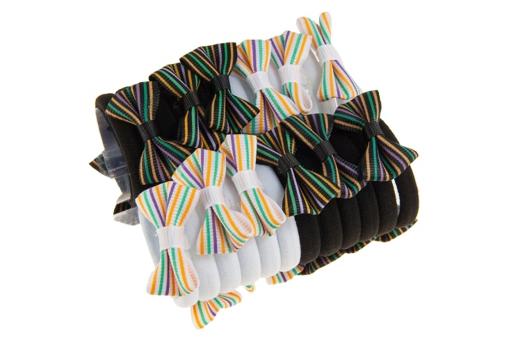 Klasyczne gumki do włosów ozdobiene uroczą, materiałową kokardką.Gumki są w dwóch kolorach: biały i czarny.