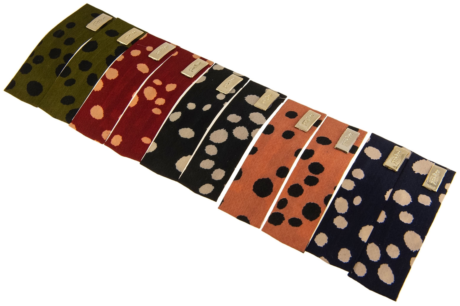 Klasyczne spinki do włosów pokryte wzorzystym materiałem.Zestaw składa się z pięciu kolorów: butelkowa zieleń, granatowy, czarny, bordowy i morelowy.