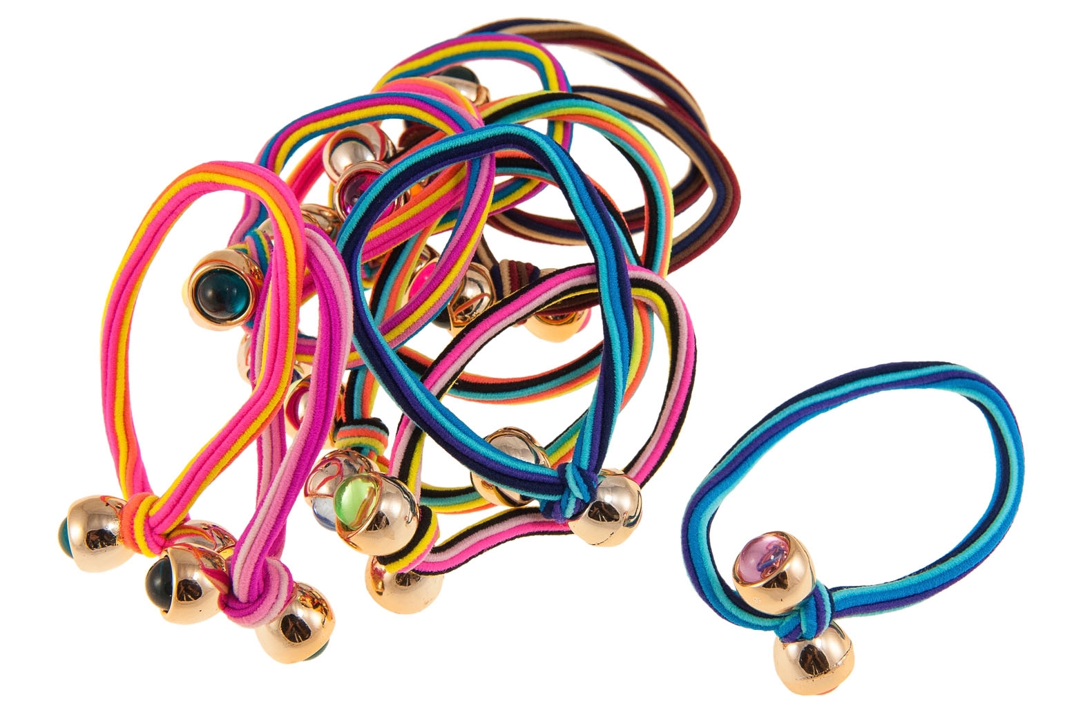 Kolorowe gumki do włosów, dobrze trzymają włosy.Gumki w paski ze złotą ozdobą z kolorowym szlifowanym kamieniem.