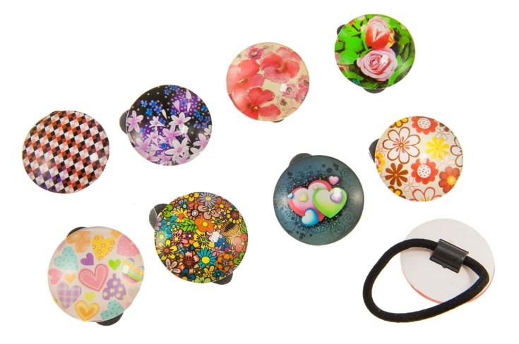 Klasyczne gumki do włosów, są wytrzymałe i dobrze trzymają włosy. Gumki posiadają kolorową, wzożystą ozdobę pokrytą żywicą.