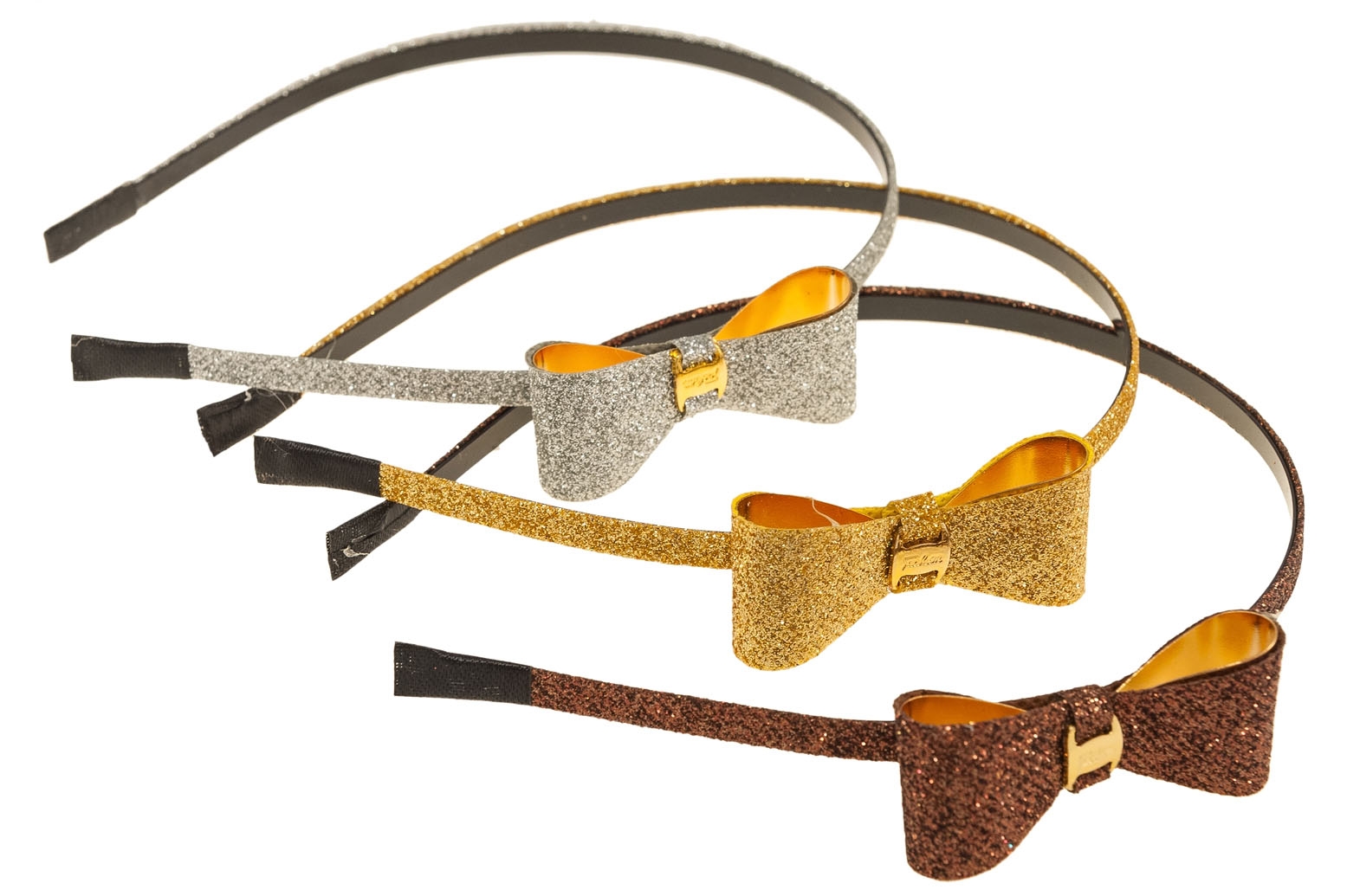 Cienka opaska wykonana z trwałego materiału, ozdobiona brokatem i kokardą.Zestaw składa się z trzech kolorów: srebrny, złoty i brązowy.