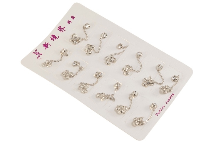 Dwa kolczyki połączone łańcuszkiem. Jeden kolczyk jest w kształcie kokardki, a drugi to pięknie mieniący się kamień.Kolczyki w kolorze srebrnym.