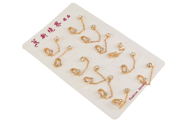 Dwa kolczyki połączone łańcuszkiem. Jeden kolczyk jest w kształcie serduszka, a drugi to pięknie mieniący się kamień.
