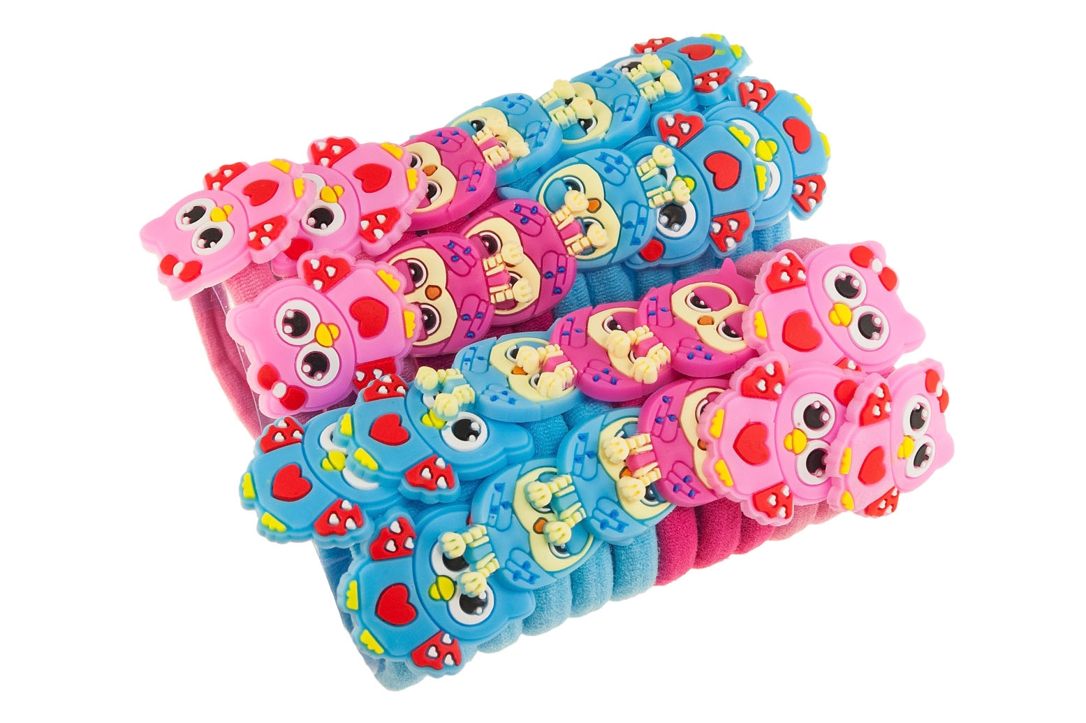 Klasyczne gumki do włosów z uroczą ozdobą w kształcie sowy.Zestaw składa się z czterech kolorów: błękitny, niebieski, jasny i ciemny różowy.