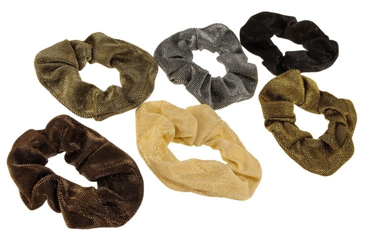 Modna gumka do włosów, scrunchie, wykonana z brokatowego materiału.Zestaw składa się z sześciu kolorów: brązowy, beżowy, ecru, srebrny, złoty i czarny.