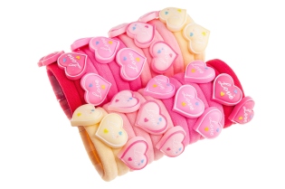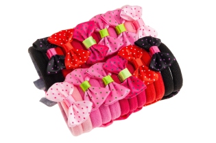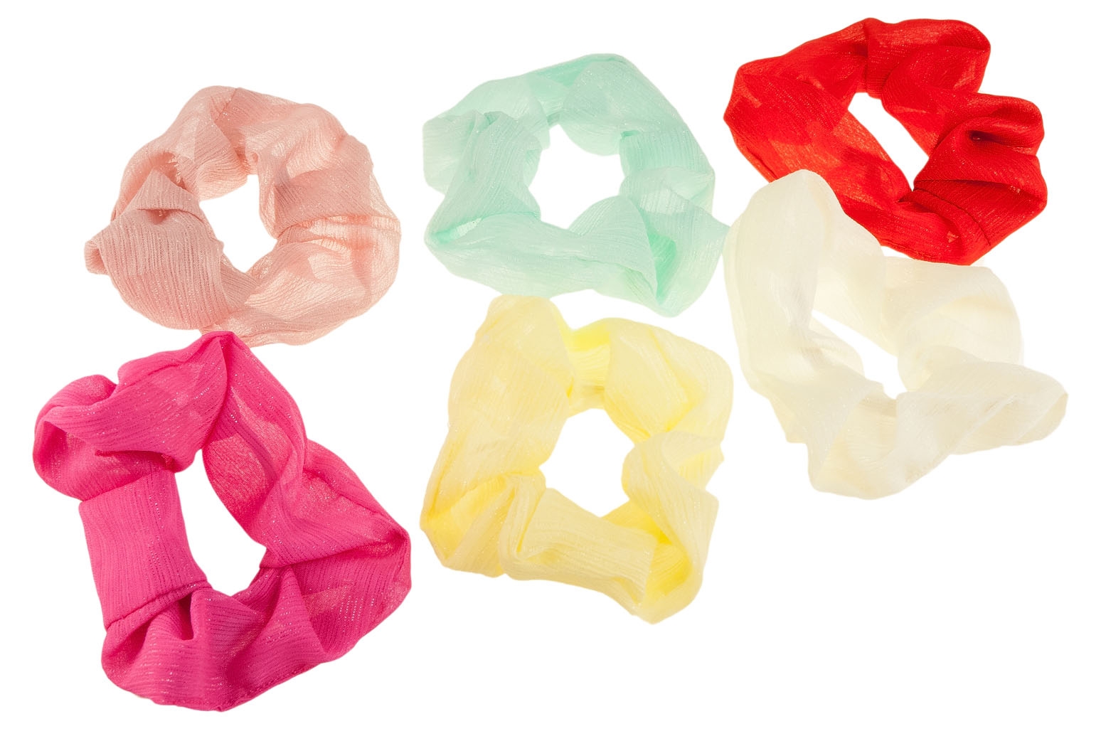 Modna gumka do włosów, scrunchie, wykonana z materiału z świecącą nitką.Zestaw składa się z sześciu kolorów: biały, żółty, różowy, czerwony, błękitny i pudrowy róż.