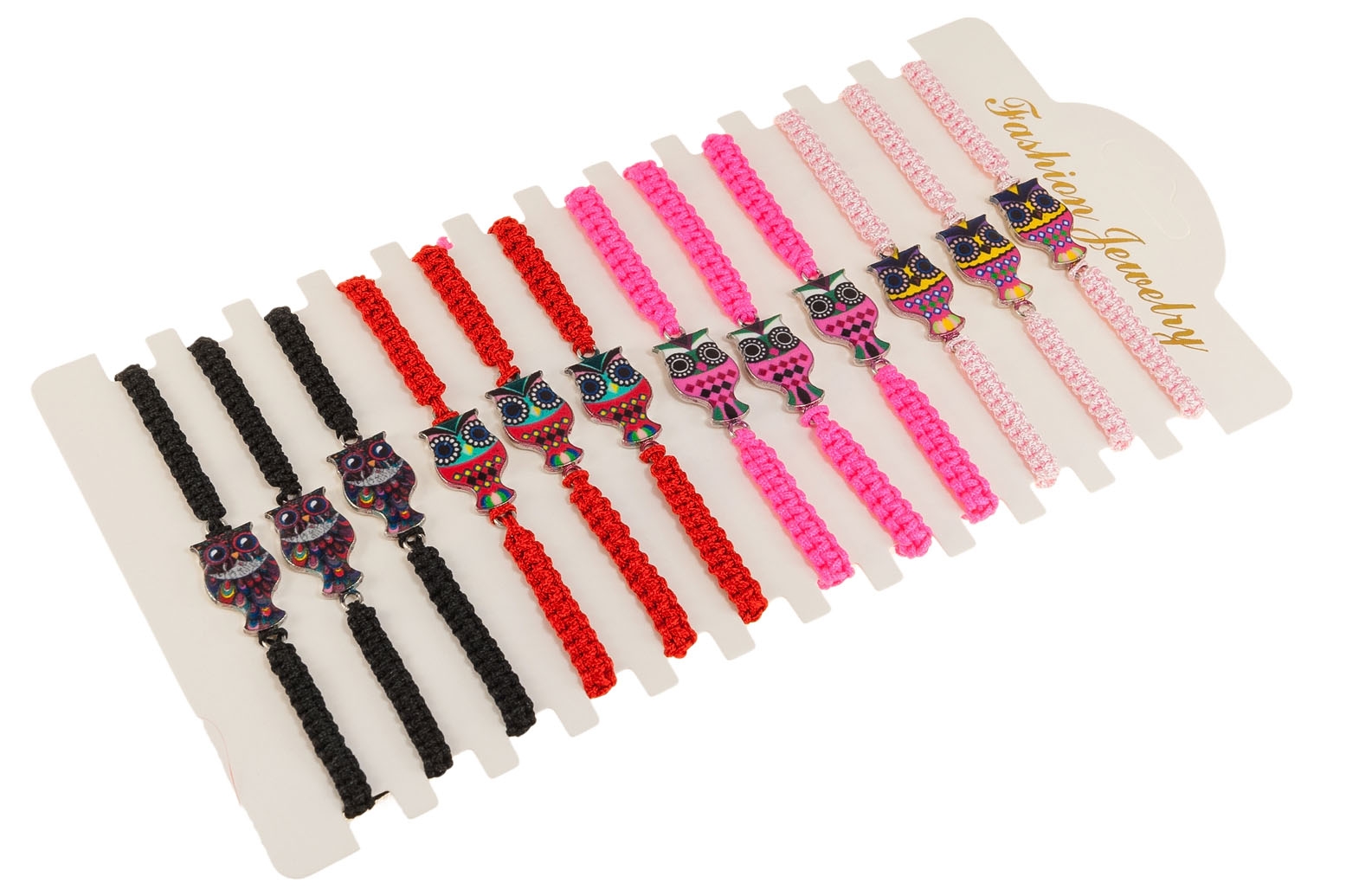 Kolorowe bransoletki, składające się ze sznurków i ozdoby w kształcie sowy.