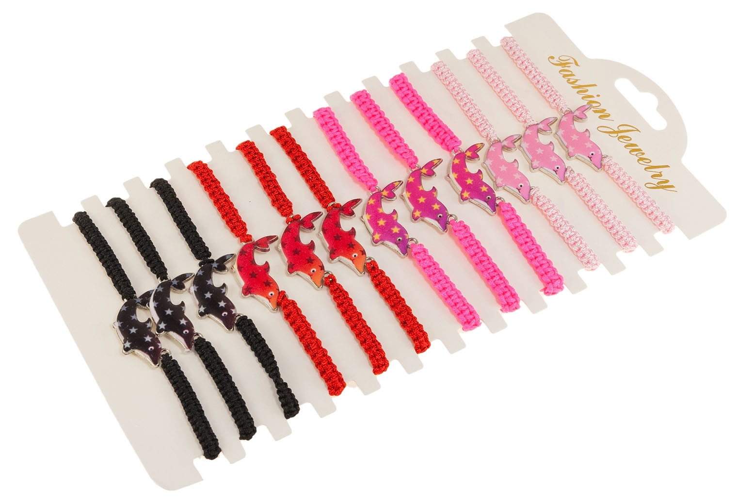 Kolorowe bransoletki, składające się ze sznurków i ozdoby w kształcie delfinka.Bransoletka posiada regulację.