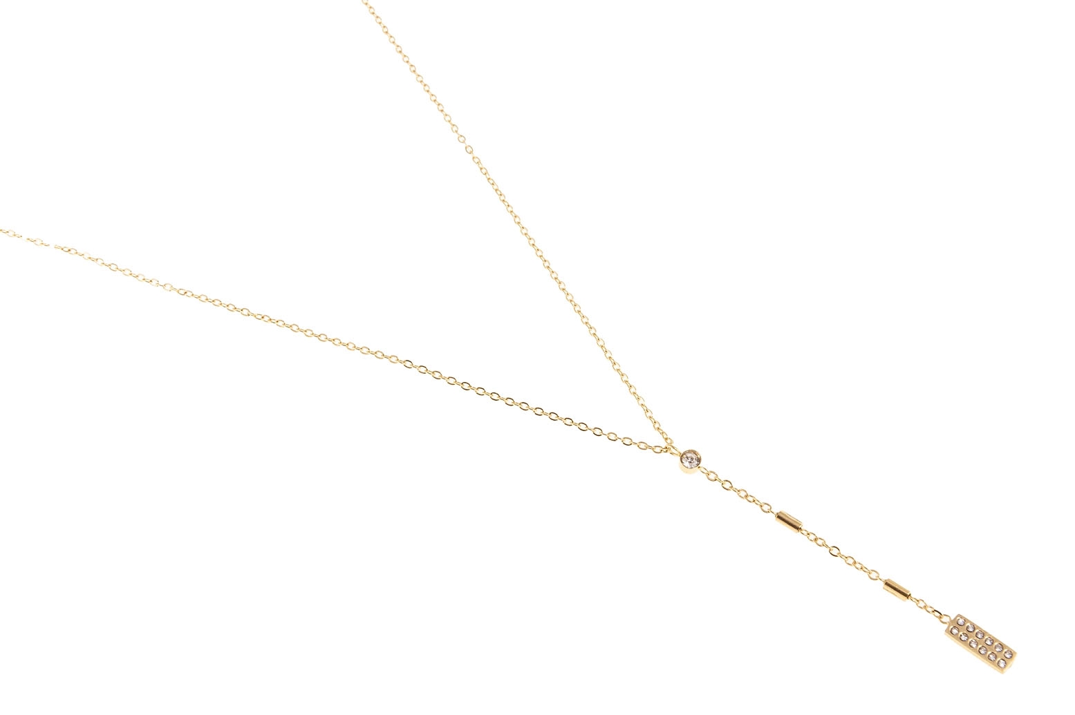 Elegancki, złoty łańcuszek z długą przywieszką ozdobioną szlifowanymi kamieniami.Długość łańcuszka: 40 cm