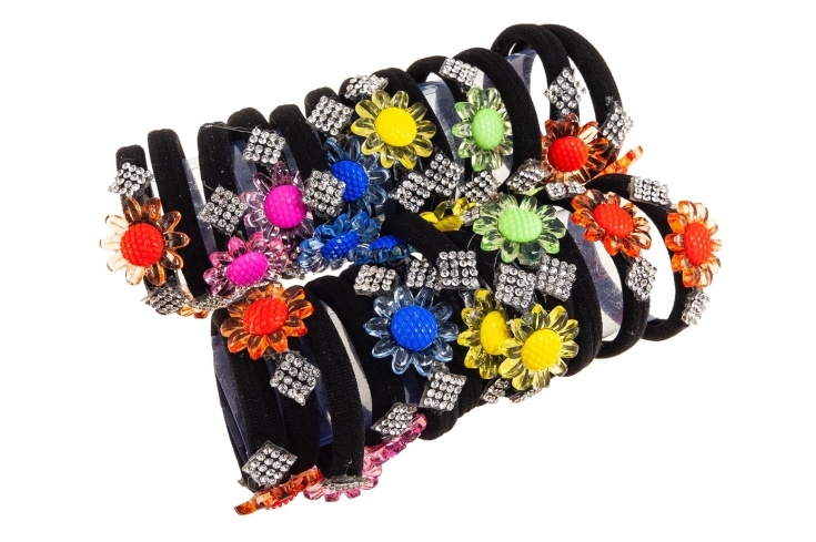 Klasyczne gumki do włosów z uroczą ozdobą w kształcie kwiatka.Zestaw składa się z pięciu kolorów: pomarańczowy, żółty, niebieski, zielony i różowy.