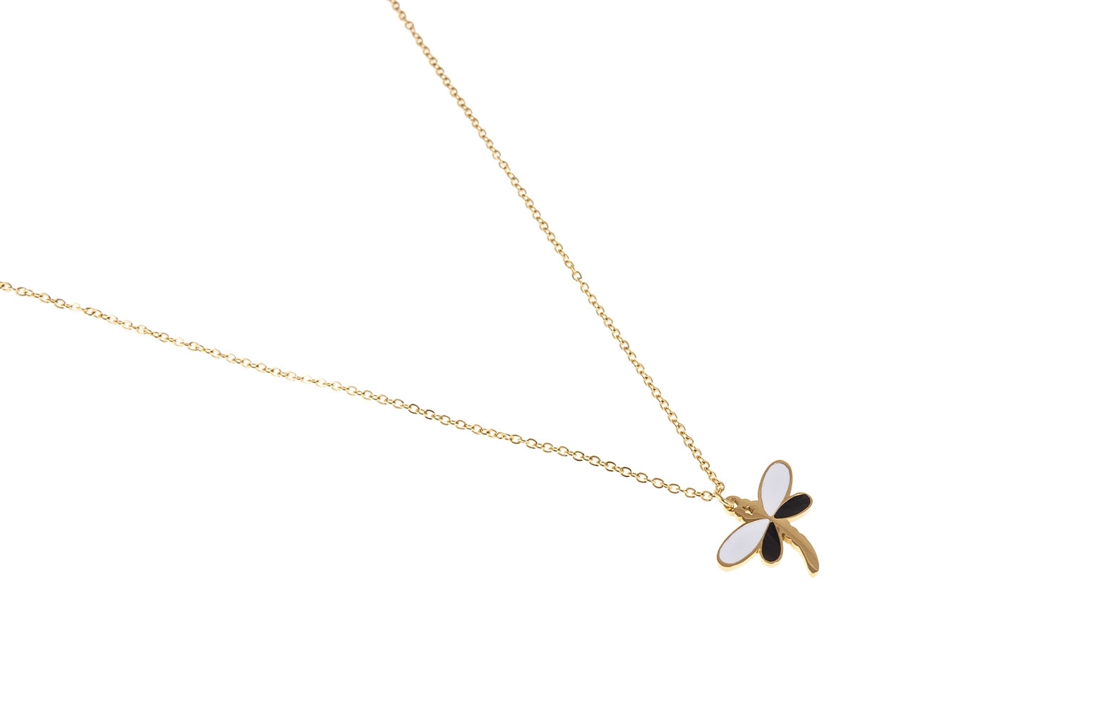 Elegancki złoty naszyjnik z biało-czarną ważką