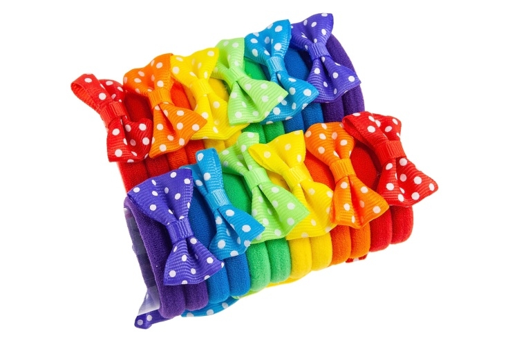 Klasyczne gumki do włosów z uroczymi kokardkami w kropki.Zestaw składa się z sześciu kolorów: fioletowy, niebieski, zielony, żółty, pomarańczowy i czerwony.