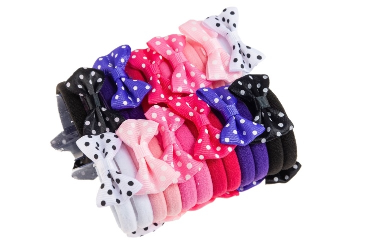 Klasyczne gumki do włosów z uroczymi kokardkami w kropki.Zestaw składa się z sześciu kolorów: granatowy, czarny, bialy, pudrowy róż, jasny i ciemny różowy.