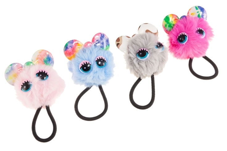 Klasyczne gumki do włosów z pomponem z oczkami i kokardką.Zestaw składa się z czterech kolorów: błękitny, szary, jasny i ciemny różowy.