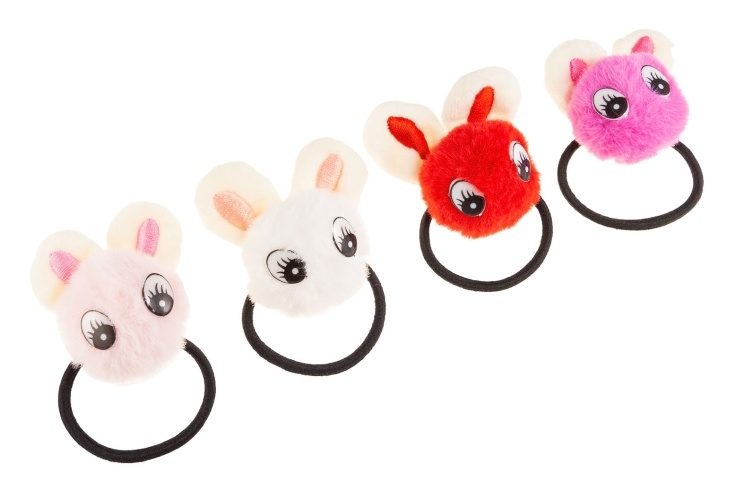 Klasyczne gumki do włosów z pomponem z oczkami i kokardką.Zestaw składa się z czterech kolorów: biały, czerwony, jasny i ciemny różowy.
