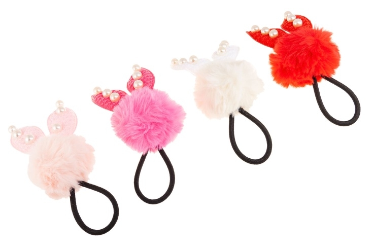 Klasyczne gumki do włosów z pomponem z uszami.Zestaw składa się z czterech kolorów: biały, czerwony, jasny i ciemny różowy.