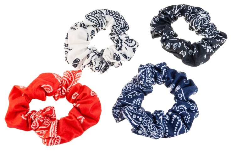 Modna gumka do włosów, wykonana z wzorzystego materiału.Zestaw składa się z czterech kolorów: biały, czerwony, granatowy i czarny.