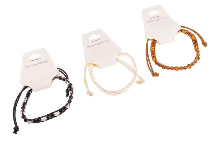 Pleciona bransoletka wykonana ze sznurka ozdobiona szlifowanymi koralikami.Zestaw składa się z trzech kolorów: czarny, biały i brązowy.