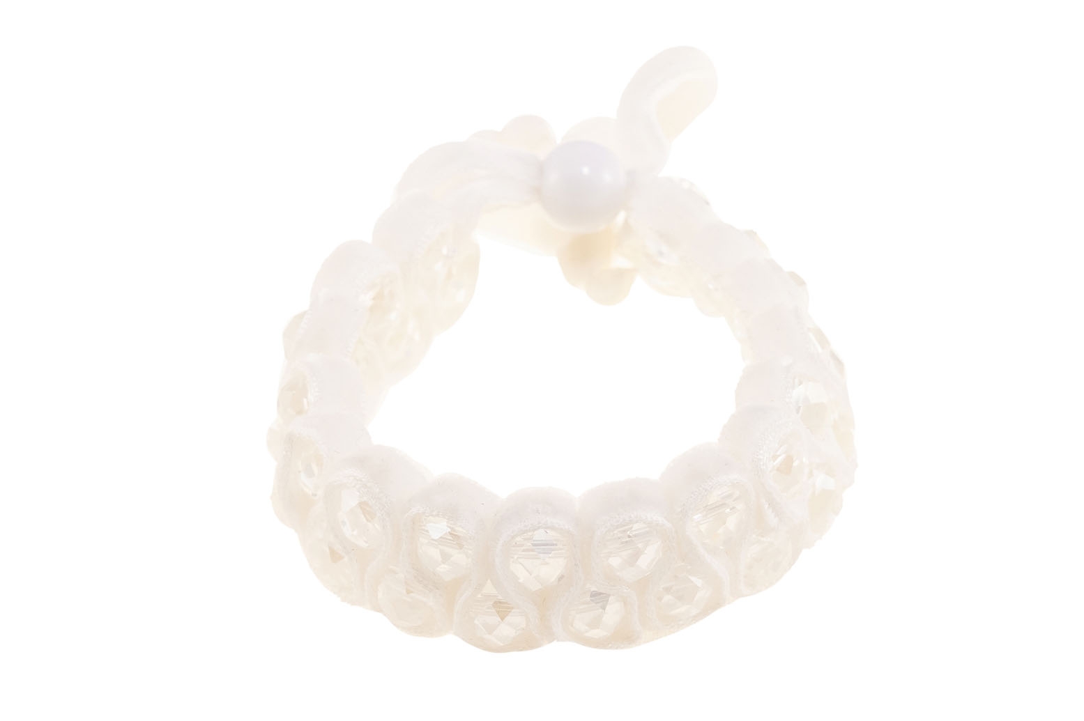 Pleciona bransoletka wykonana z białej tasiemki ozdobiona szlifowanymi koralikami.