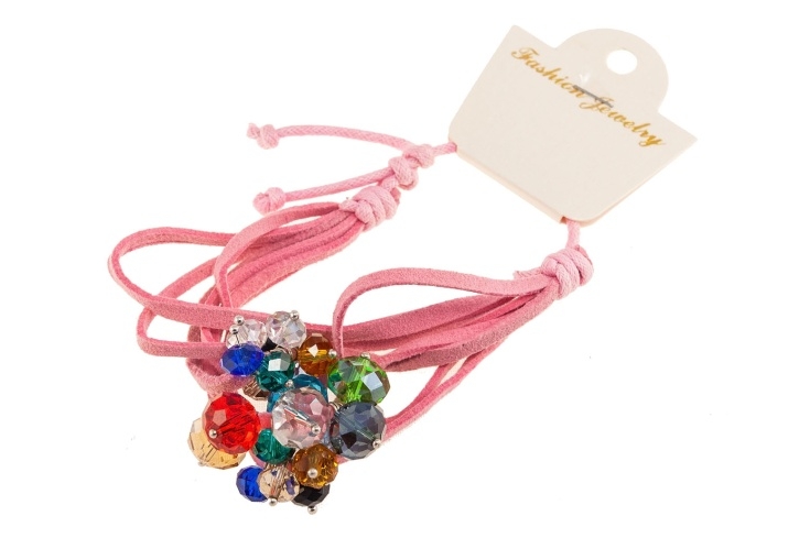 Bransoletka w kolorze różowym z kolorowymi koralikami.