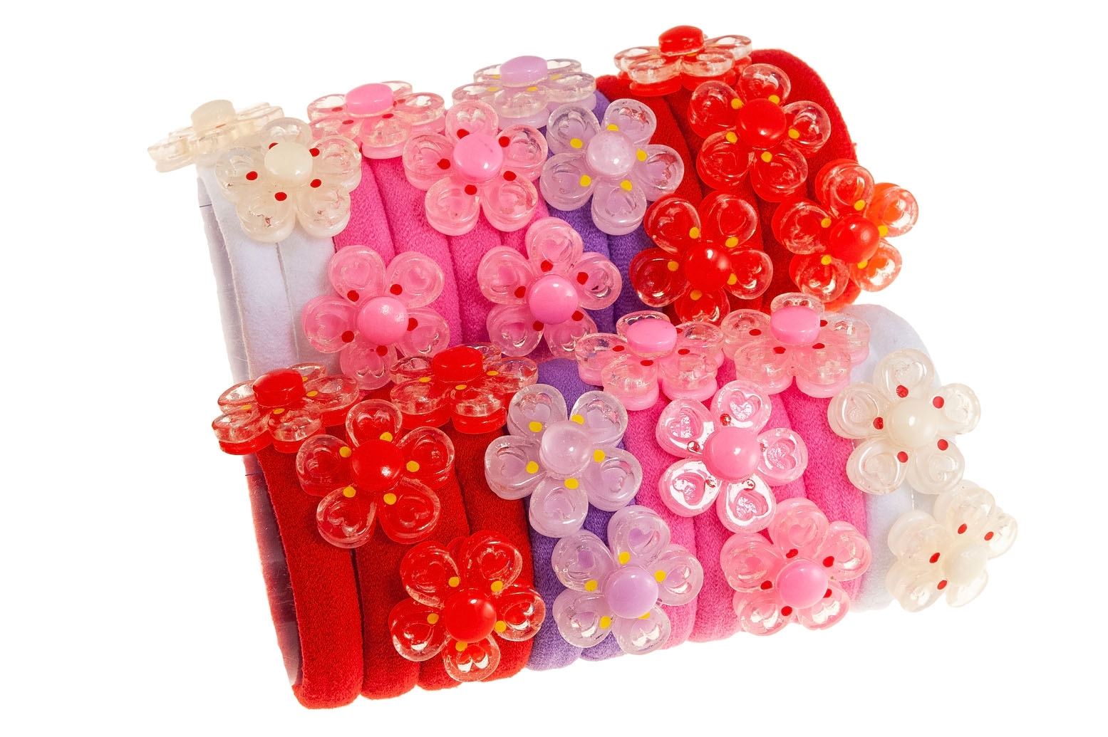 Klasyczne gumki do włosów z uroczą ozdobą w kształcie kwiatka.Zestaw składa się z czterech kolorów: fioletowy, biały, czerwony i różowy.