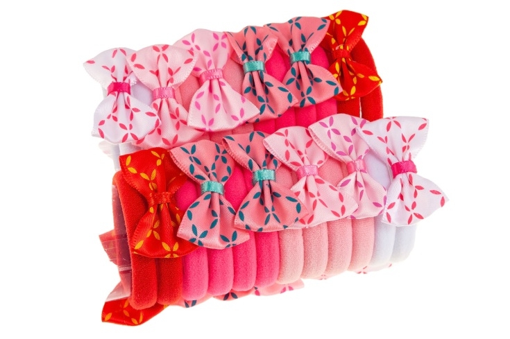 Klasyczne gumki do włosów z uroczymi, materiałowymi kokardkami.Zestaw składa się z czterech kolorów: czerwony, biały, jasny i ciemny różowy.