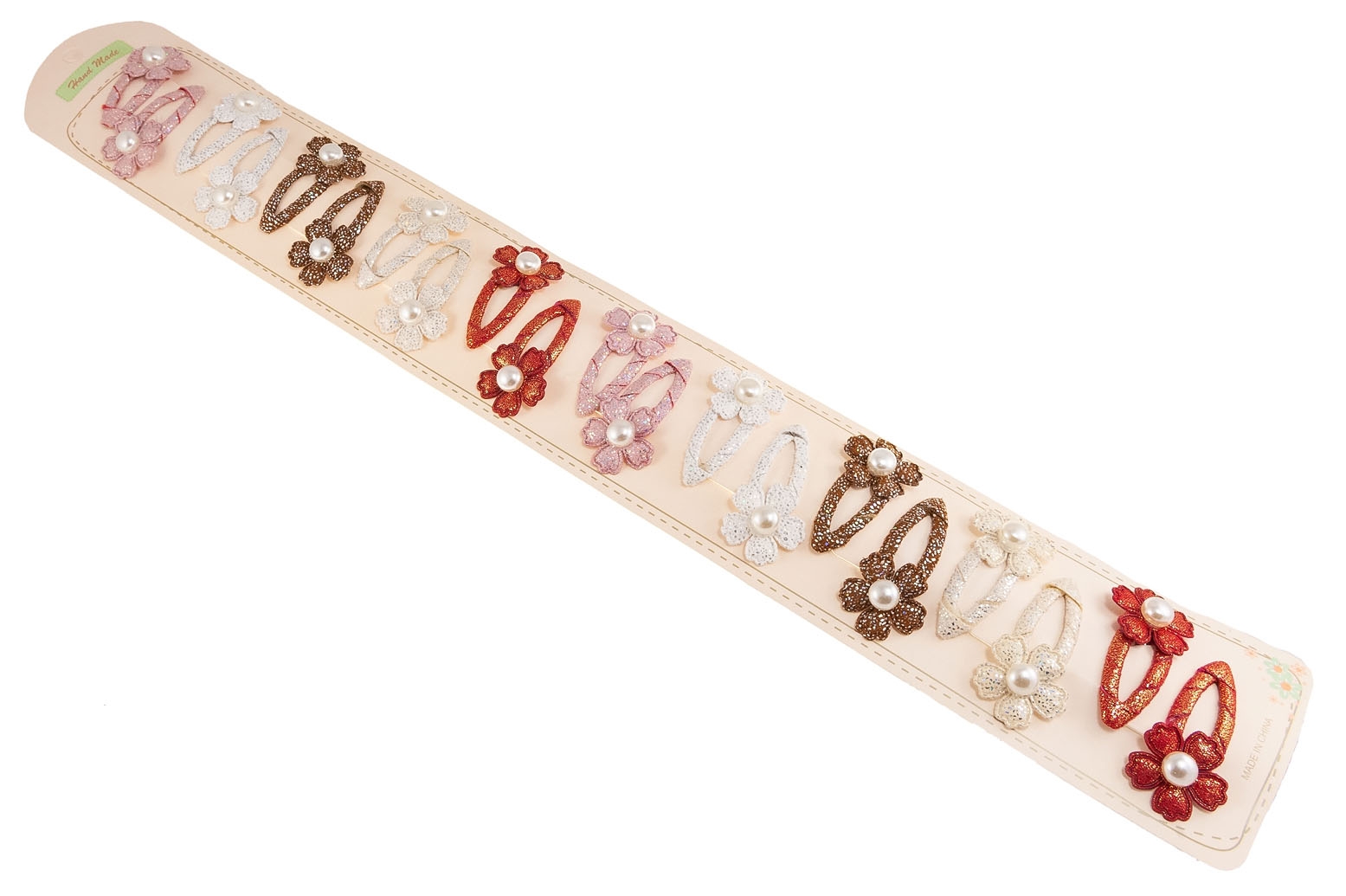 Spinki pokryte brokatowym materiałem z uroczą ozdobą w kształcie kwiatka.Zestaw składa się ze spinek w pięciu kolorach: czerwony, beżowy, brązowy, biały i różowy.
