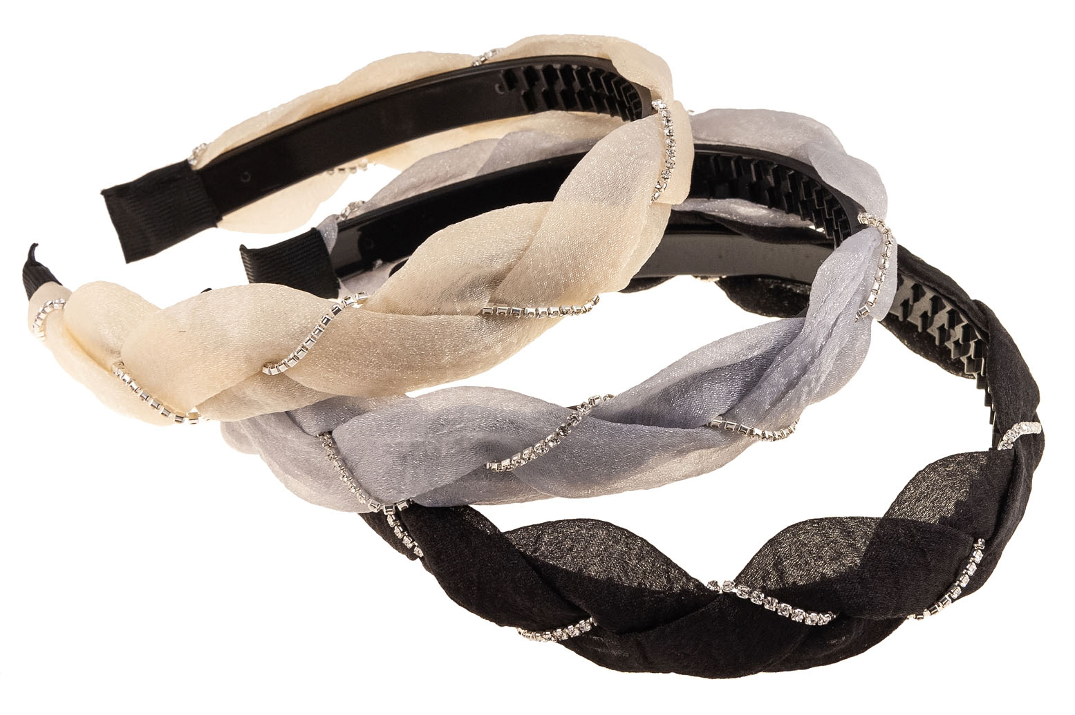 Szeroka opaska pokryta materiałowym warkoczem, ozdobionym taśmą dzetową.Zestaw skłąda się z trzech kolorów: czarny, szary i beżowy.