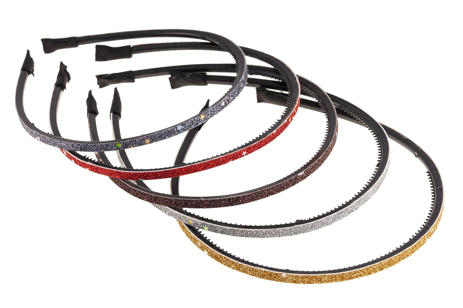 Cienka opaska wykonana z trwałego materiału, ozdobiona brokatem i błyszczącymi gwiazdkami.Zestaw składa się z pięciu kolorów: grafit, czerwony, brązowy, srebrny i złoty.