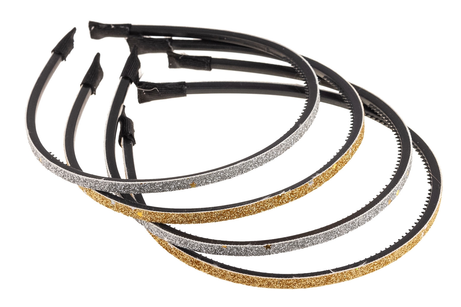 Cienka opaska wykonana z trwałego materiału, ozdobiona brokatem i błyszczącymi gwiazdkami.
