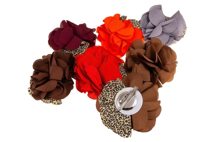Elegancka ozdoba w kształcie kwiatka, wykonana z materiału. Ozdoba posiada dwa rodzaje zapięcia: broszka i górniak.