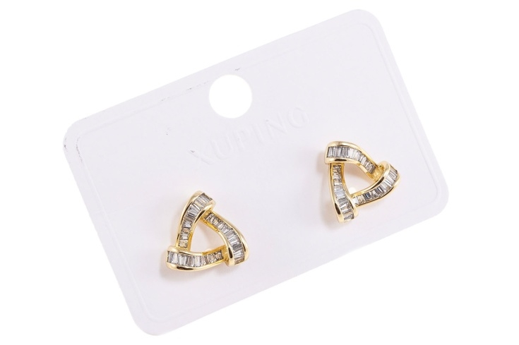 Eleganckie, złote kolczyki w kształcie trójkątów ozdobine szlifowanymi kamieniami.Wymiary kolczyków: