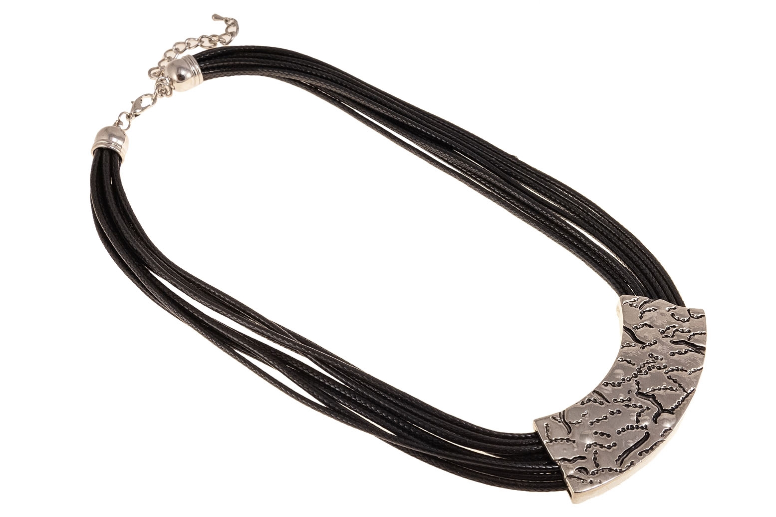 Oryginalny naszyjnik składający się z czarnych rzemyków i ozdobnego metalu w srebrnym kolorze.Wymiary łańcuszka: