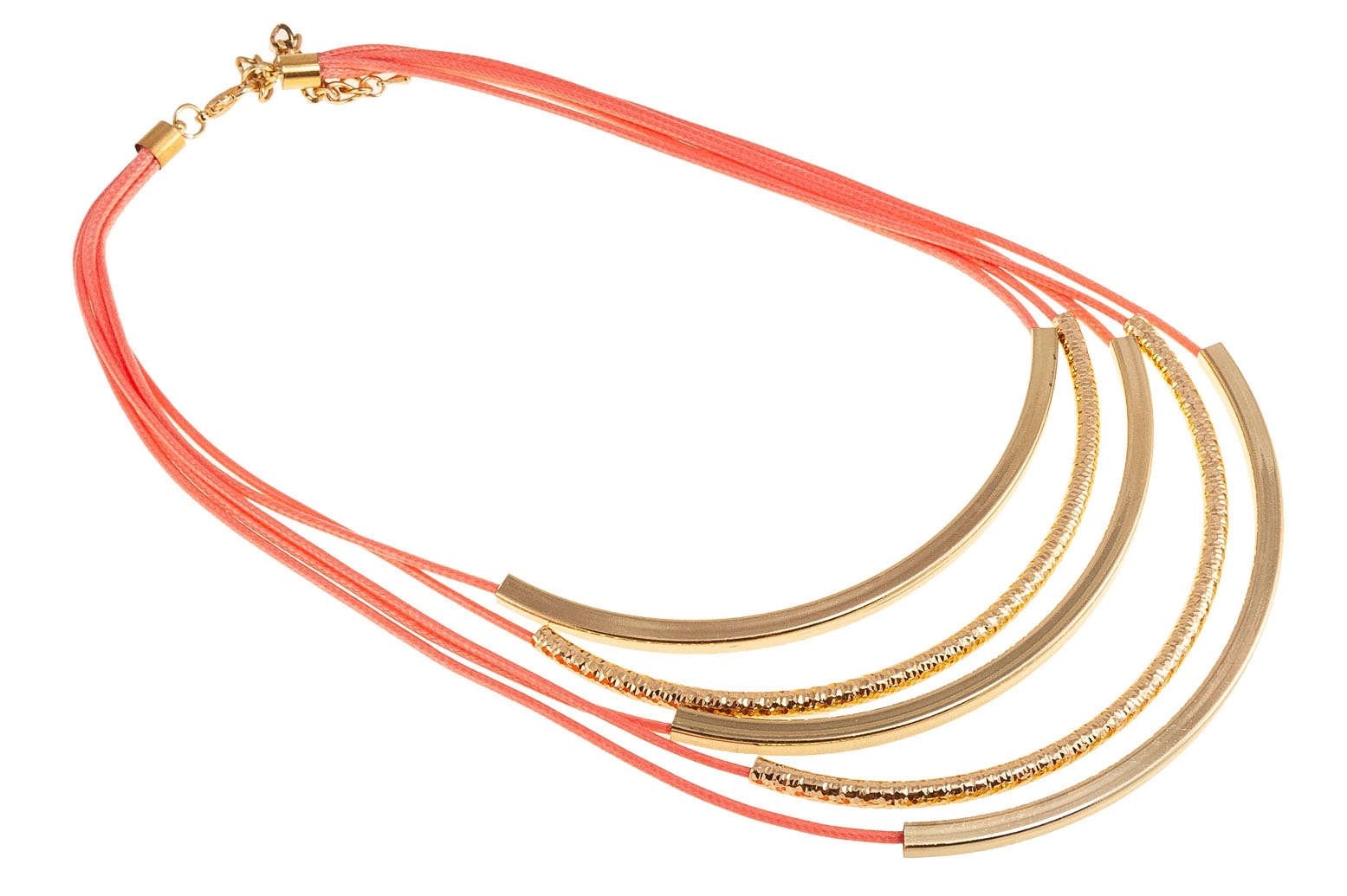 Oryginalny naszyjnik składający się z rzemyków w kolorze koralowym i ozdobnego metalu w złotym kolorze.Wymiary łańcuszka: