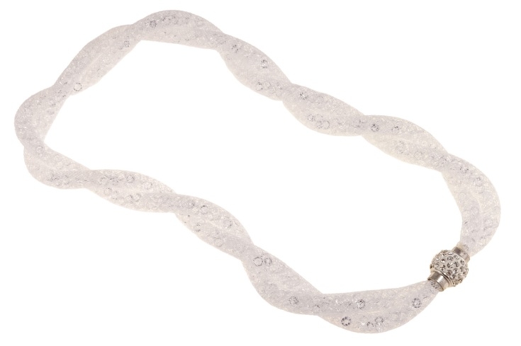 Oryginalny naszyjnik wykonany ze splecionych dwóch rurek wypełnionych dżetami. Naszyjnik ozdobiony jest koralikiem poktytym dżetami.Wymiary łańcuszka: