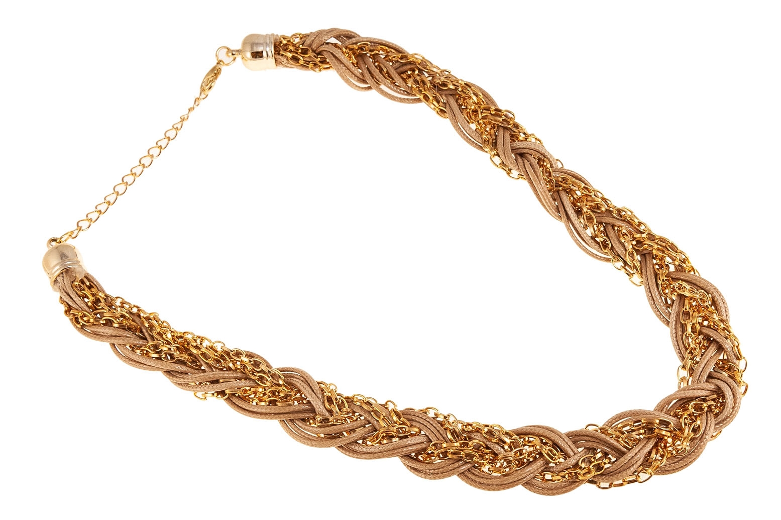 Oryginalny naszyjnik zapleciony w warkocz, składający się z brązowego rzemyka i złotego łańcuszka.Wymiary łańcuszka: