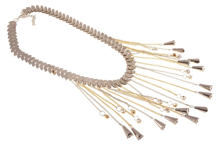 Oryginalny naszyjnik w kolorze srebrnym, ozdobiony wielona wiszącymi przywieszkami w srebrnym i złotym kolorze.Wymiary łańcuszka:
