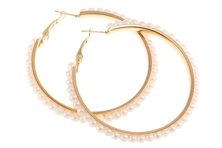 Modne w tym sezonie kolczyki koła.Kolczyki w kolorze złotym ozdobione są białymi perłami.