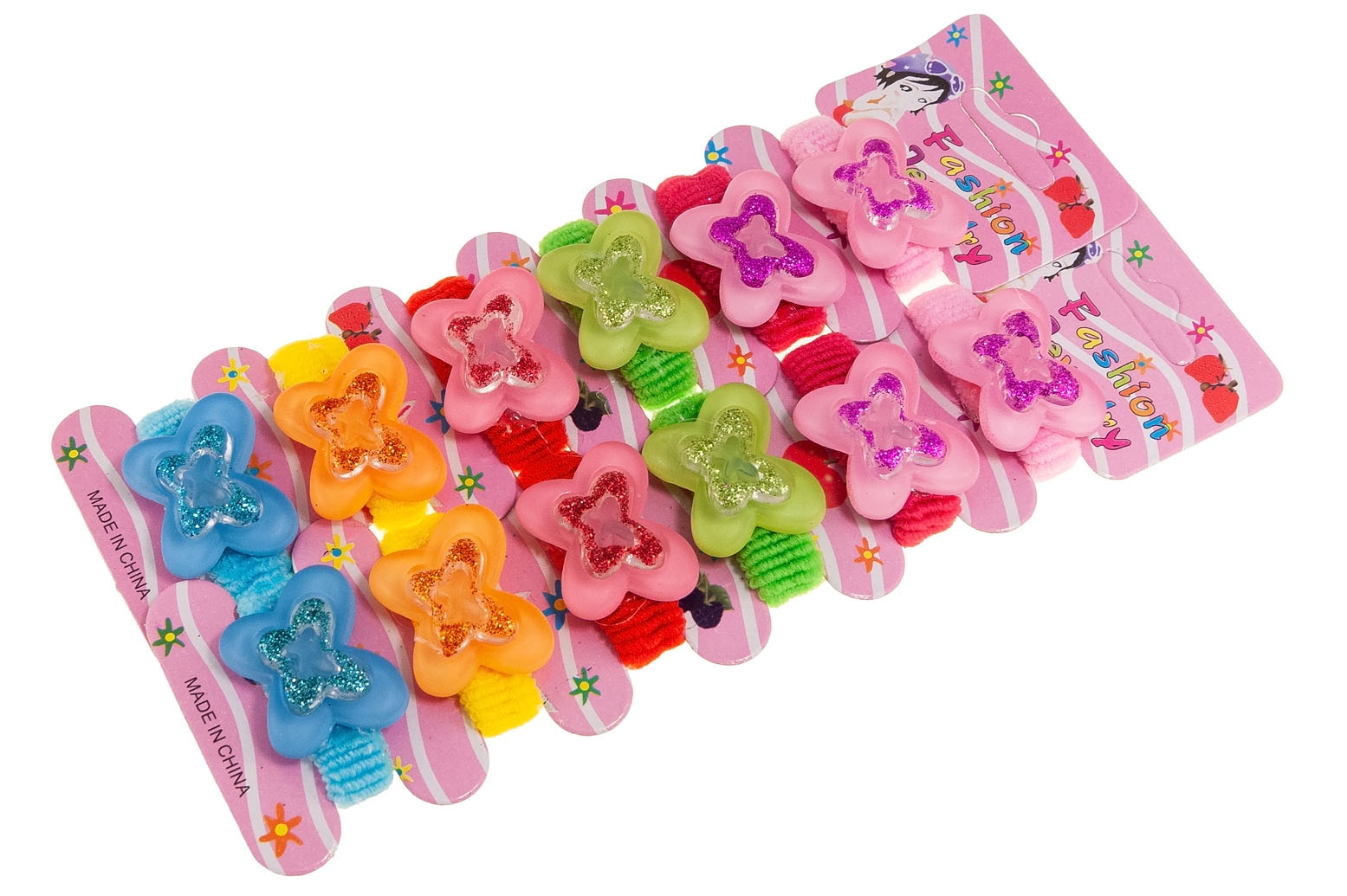 Klasyczne gumki do włosów z uroczą ozdobą w kształcie motylka.Zestaw składa się z sześciu kolorów: czerwony, niebieski, pomarańczowy, zielony, jasny i ciemny różowy.