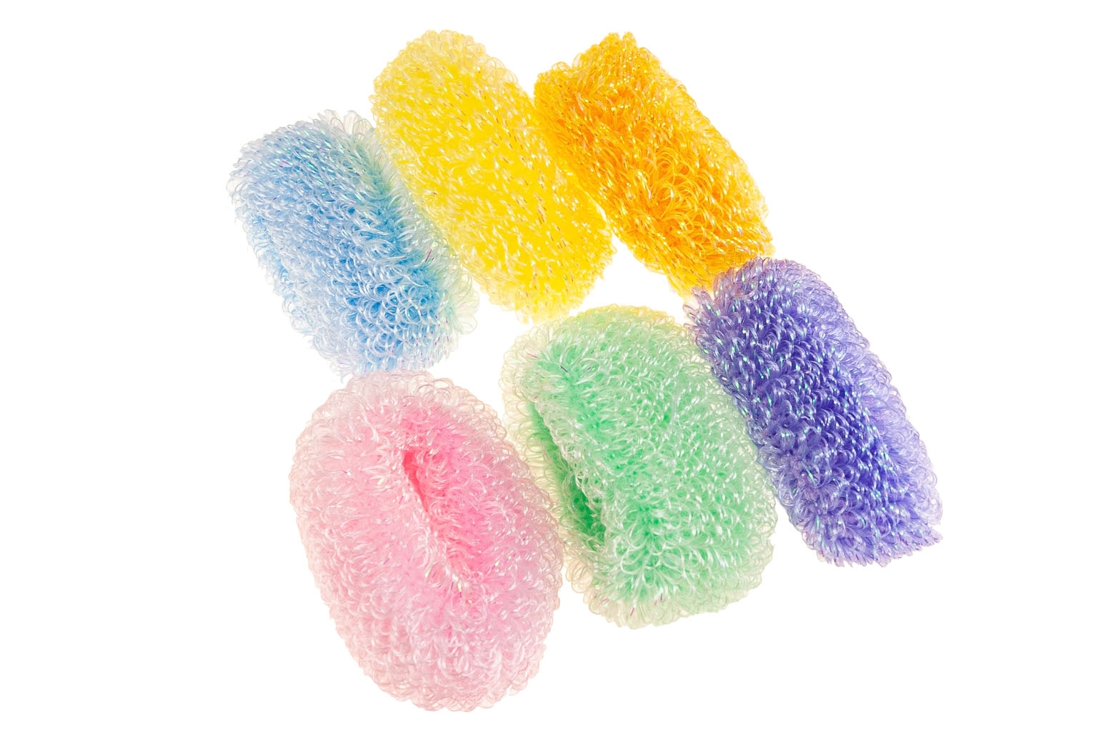 Klasyczne gumki do włosów, są wytrzymałe i dobrze trzymają włosy.Zestaw składa sie z gumek w sześciu kolorach: pomarańczowy, żółty, niebieski, różowy, zielony i fioletowy.
