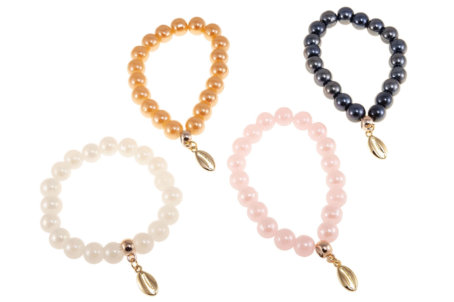 Elegancka bransoletka wykonana z perełek i przywieszki w kształcie muszelki.Zestaw składa się z czterech kolorów: różowy, biały, pomarańczowy i grafitowy.
