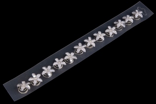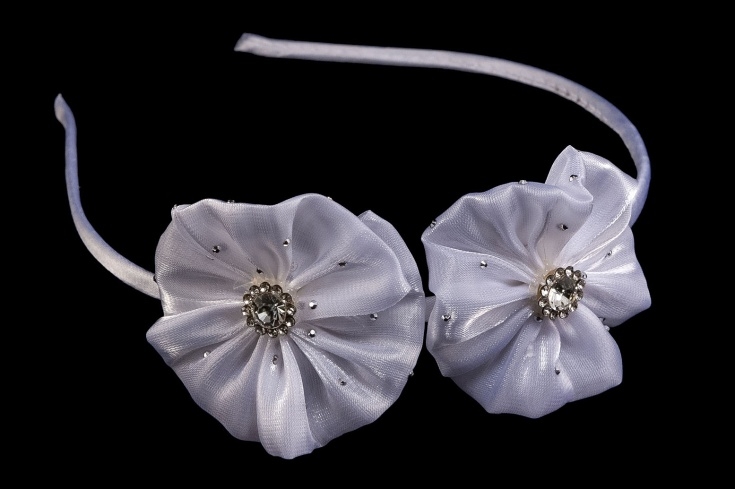 Opaska pokryta materiałem, ozdobiona materiałową kwiatkami i szlifowanymi kamieniami.