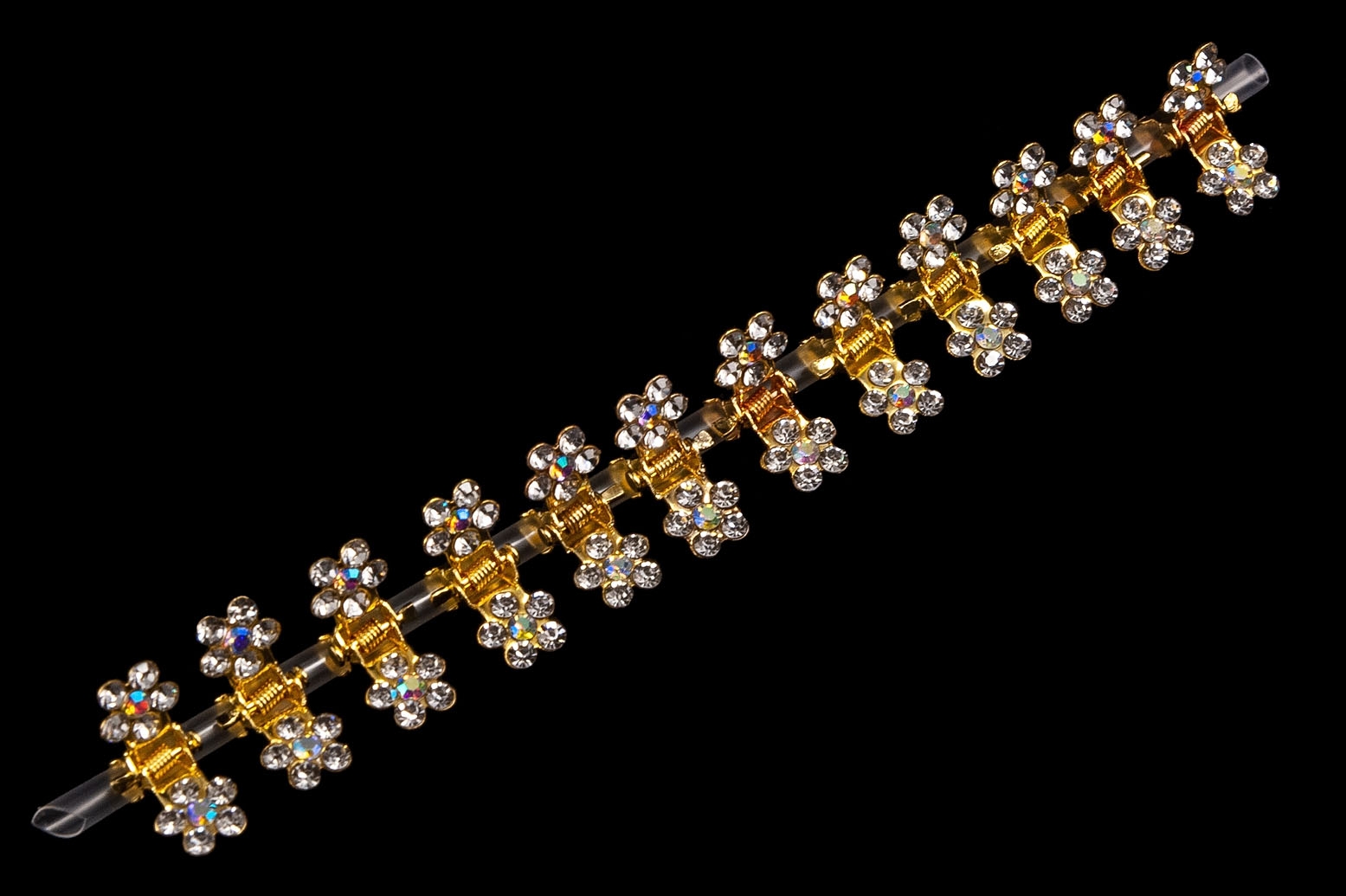 Złote miniszczęki ozdobione dżetowymi kwiatkami.Spinki nadadzą fryzurze elegancji i oryginalności.