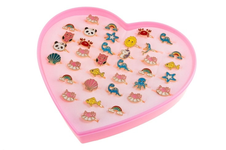 Dziecięce pierścionki w kolorze złotym ozdobione kolorową emalią.