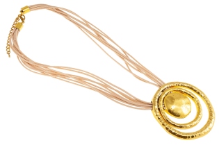 Naszyjnik w kolorze srebrnym, ozdobiony pięknie mieniącym się kamieniem.